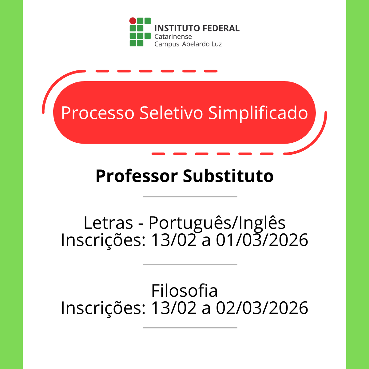 O IFC Campus Abelardo Luz está com inscrições abertas para 1 vaga de Professor Substituto 40h na área de Filosofia e 1 vaga de Professor Substituto 40h na área de Letras – Português/Inglês.